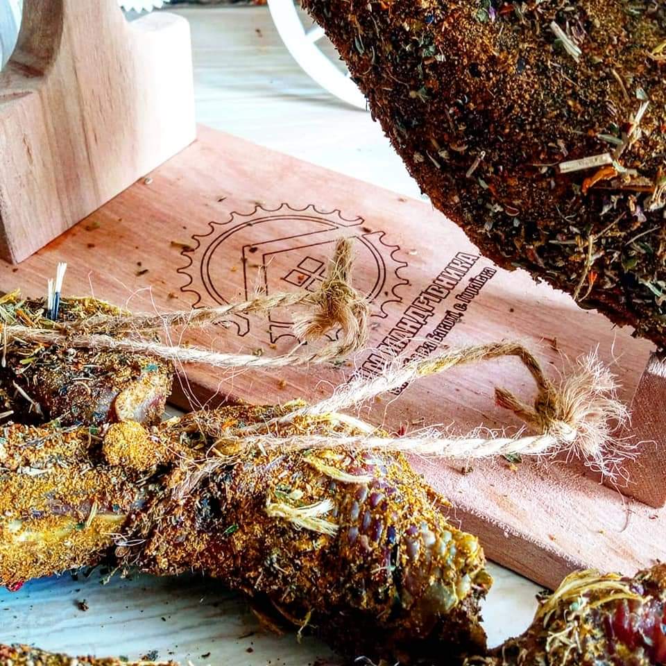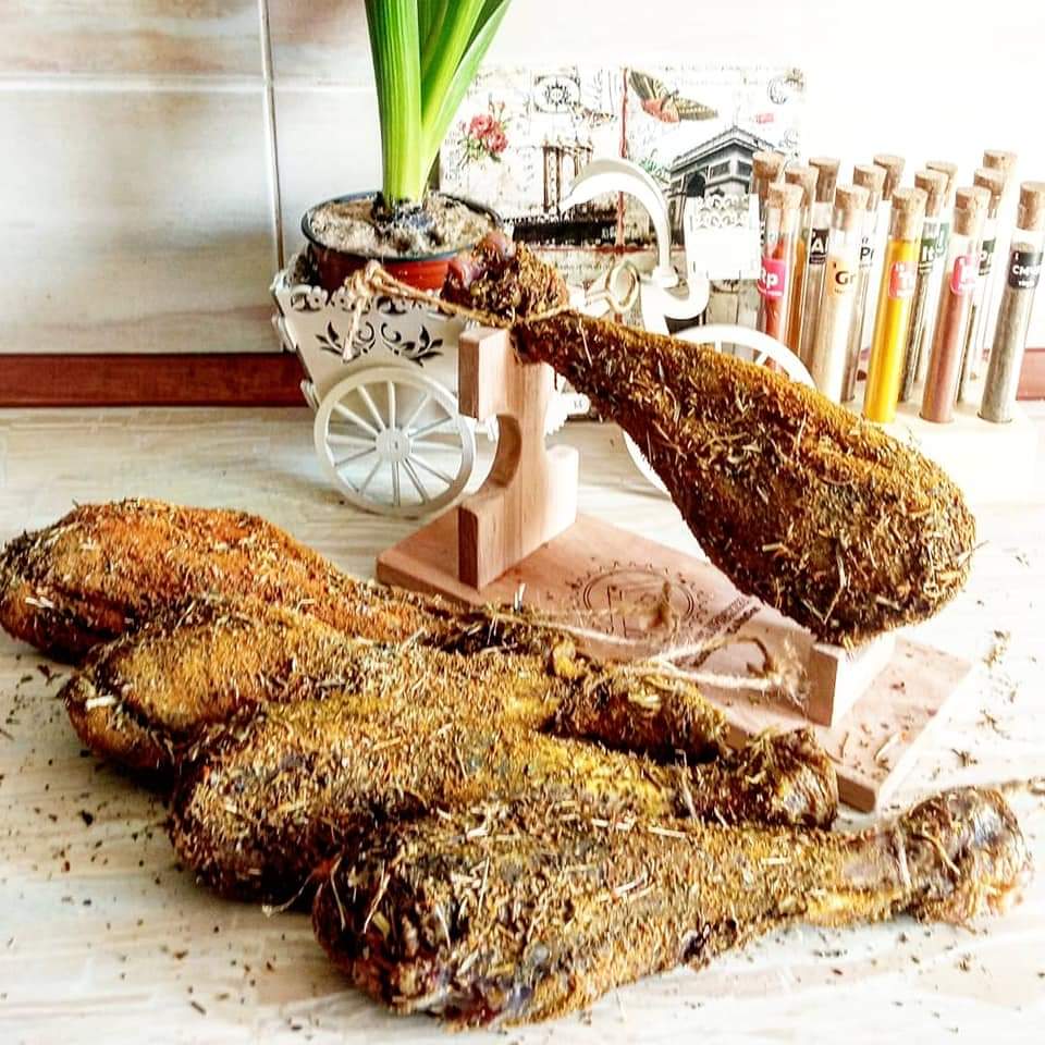 Гомілки сушать в ароматних травах протягом двох тижнів, а подають готовий мініхамон під авторський сет наливок або місцеві вина.