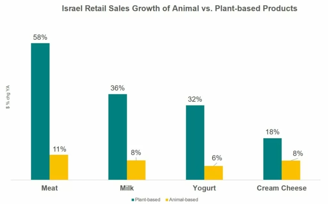 За результатами продажів, найбільший приріст в Ізраїлі торік продемонстрували гамбургери на рослинній основі, фарші та несоєве рослинне молоко — 58% та 55% відповідно. Рослинне молоко зараз складає 13% від загального ринку молока в країні.