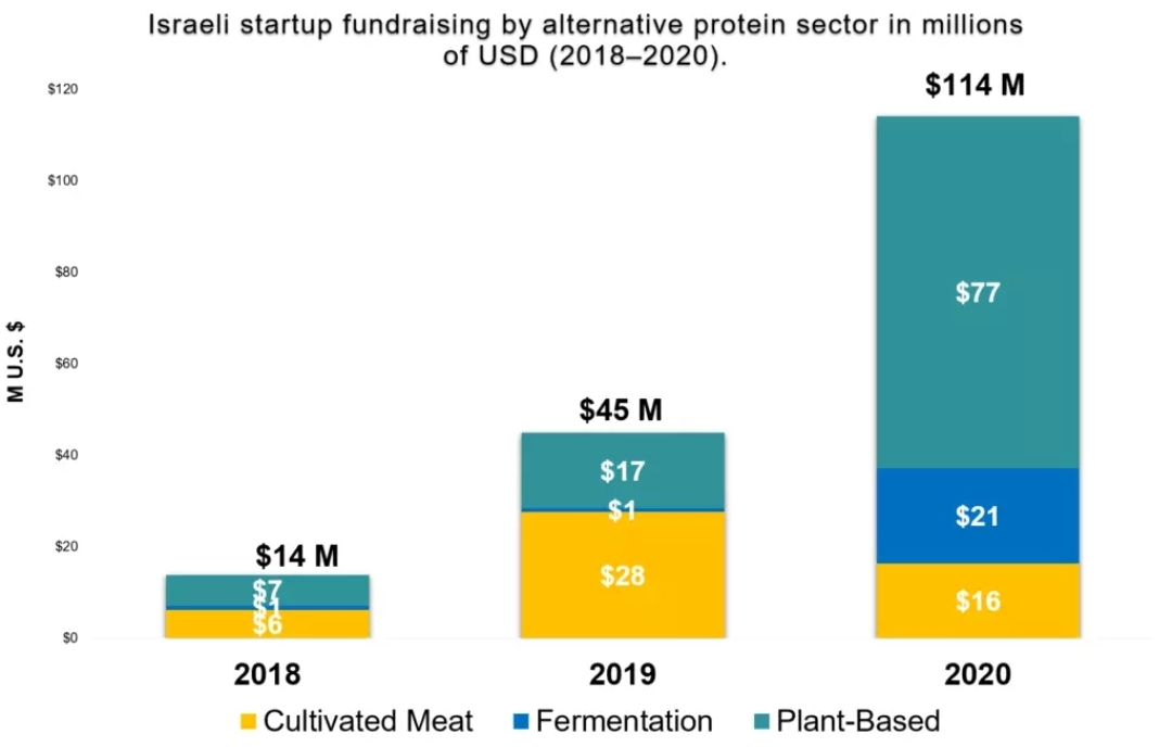 Порівняно з іншими технологічними галузями, приріст середнього капіталу, залученого за останні три роки (2018-2020 рр.) в галузь альтернативних білків, значно випереджає інші напрямки. Наприклад, кібербезпеку, яка вважається однією з місцевих провідних технологічних галузей та посідає друге місце із середнім річним зростанням інвестицій 49%.