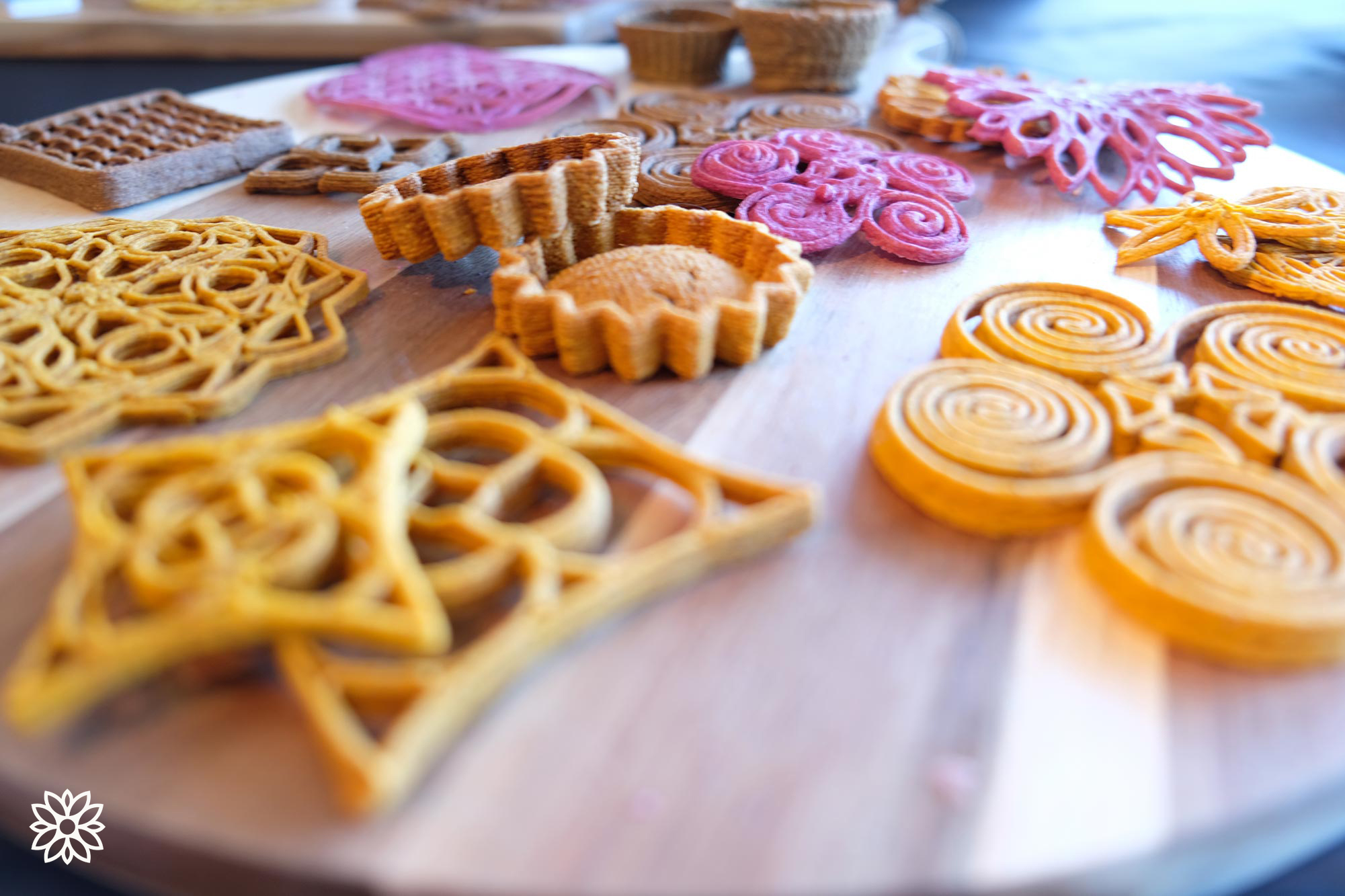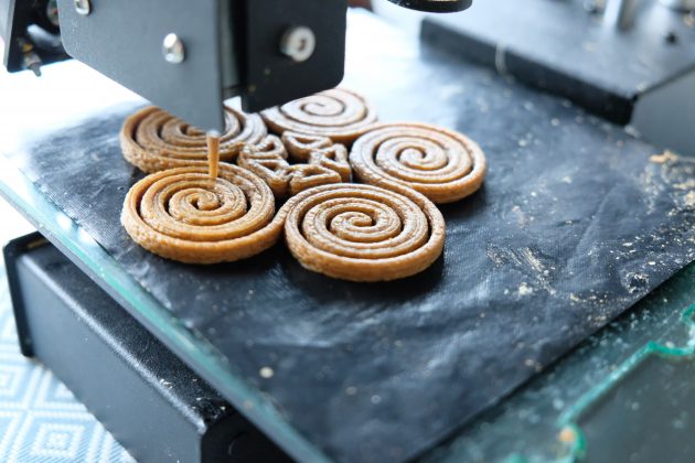 Друк розпочали з бананових шкурок, черствого хліба та моркви у вигляді пасти. Згодом вдалося створити елегантні кондитерські вироби та основи для пирогів, які зараз широко використовуються у ресторанах.