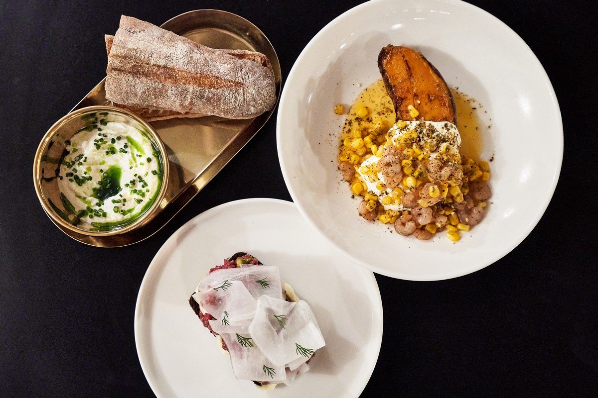 Прості інгредієнти у «Вогнику» поєднують в незвичних форматах і техніках. Наприклад, батат іде із копченим крем-сиром, креветками та кукурудзою.