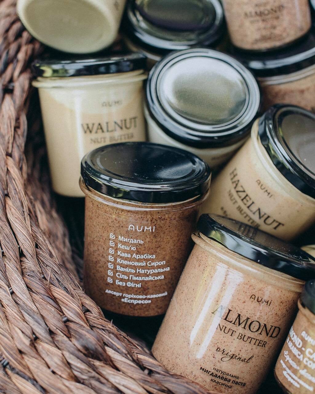 Окрім мигдальних паст AUMi створює фісташкову, арахісові, кокосову, пасту з фундуку, кеш’ю, з волоського горіха, з насіння гарбуза, насіння соняшнику і навіть насіння конопель.