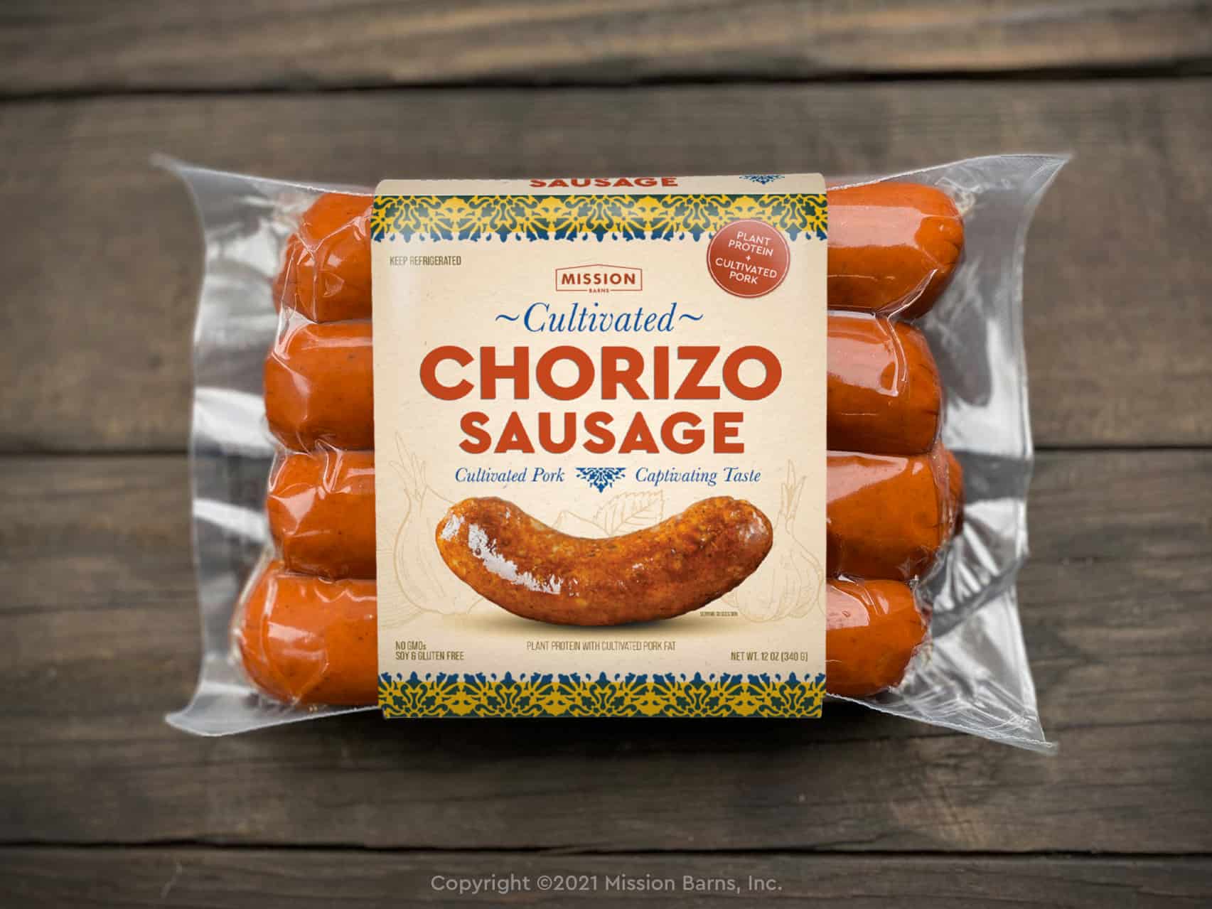 Ковбаски Mission Chorizo є гібридним продуктом, виготовленим з нерозкритих рослинних білків і культивованого свинячого жиру Mission Barns.