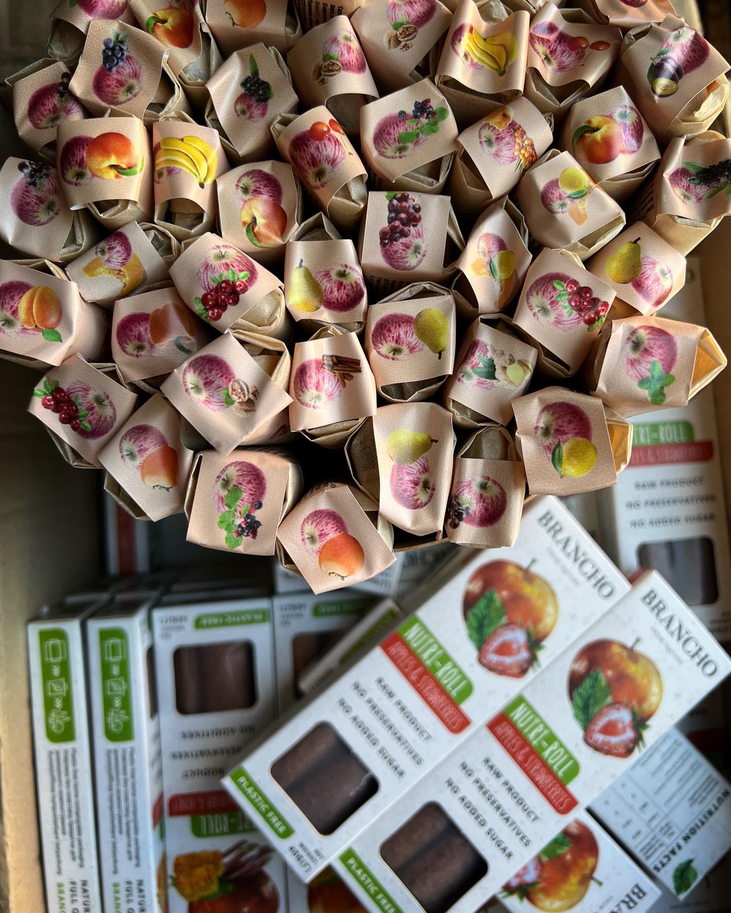 Серед ексклюзивних новинок Brancho – перекус у вигляді фруктових ролів. Унікальним є те, що ягоди та фрукти для снеків не підварюють. Щоб зберегти корисні властивості, свіжу сировину перетирають, а потім підсушують при температурі 45 градусів.