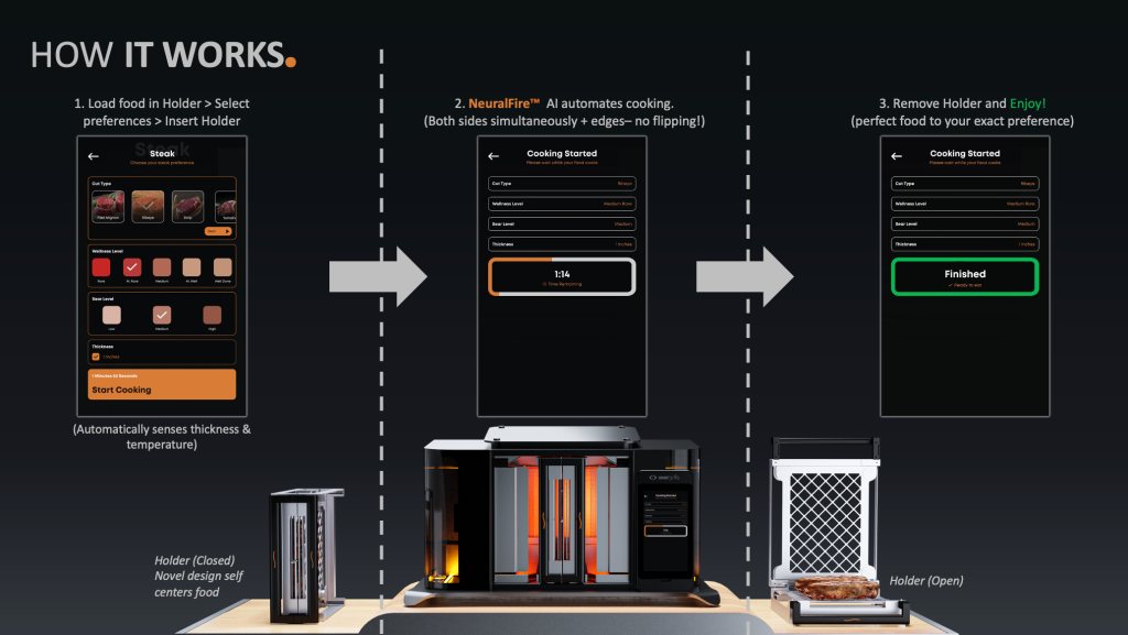 Користувач поміщає м’ясо в тримач, який визначає температуру та товщину стейку. Далі обидві сторони готуються одночасно за допомогою інфрачервоного тепла.