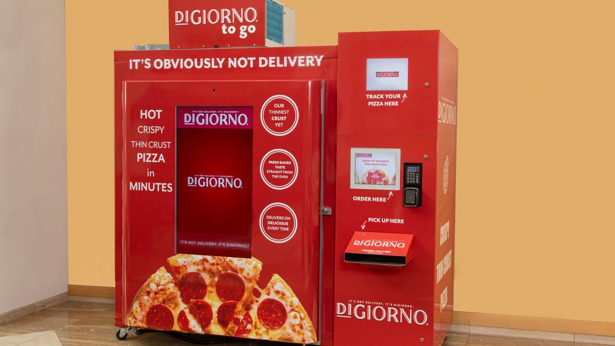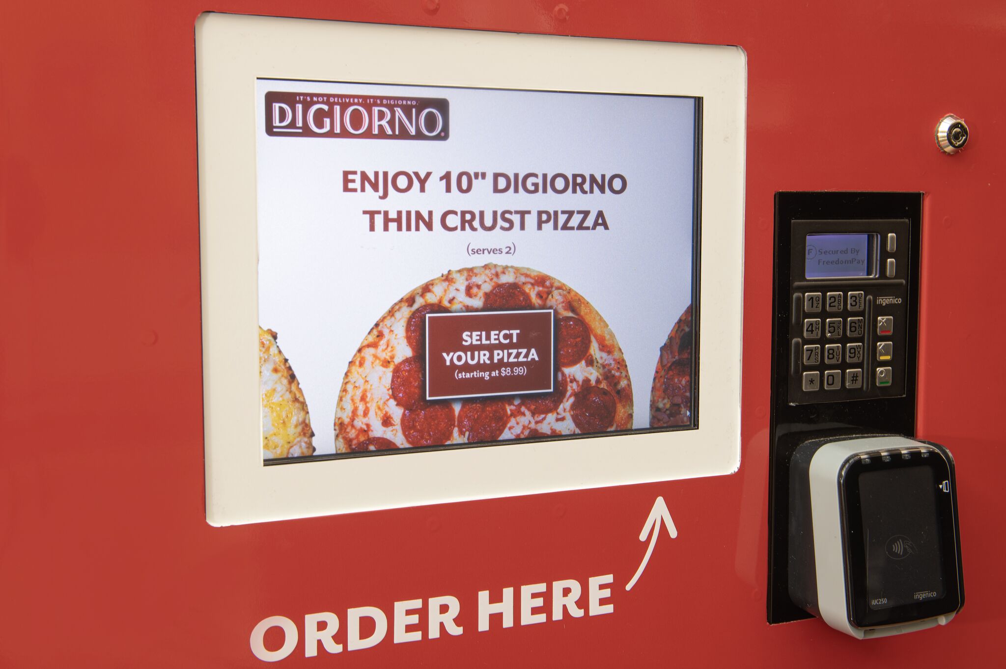 Кіоск, схожий на автомат для прокату DVD-дисків Redbox, пропонує замовити піцу з сиром або пепероні за $9. Замовлення автомат віддає через отвір.
