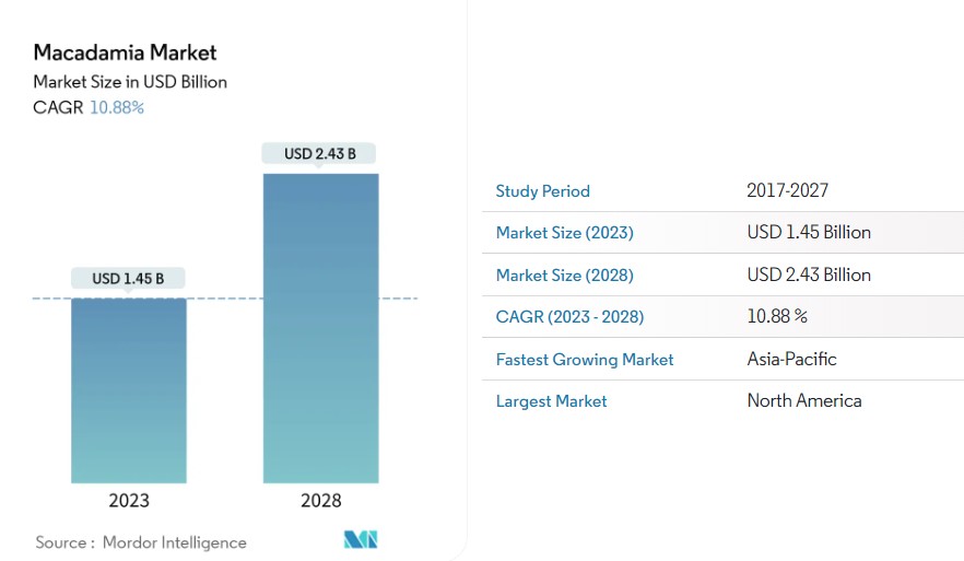 Згідно галузевого прогнозу, попит на горіхи макадамії зросте з $1,45 млрд у 2023 році до $2,43 млрд у 2028 році.