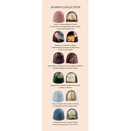 Всередині цукерок може бути поєднання абсолютно різних начинок – із мармеладу, ганашу, маршмелоу, фісташок, кокосу, маракуї, липи та м’яти тощо.