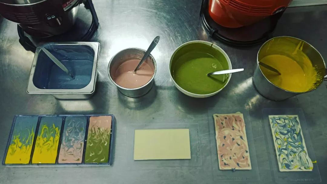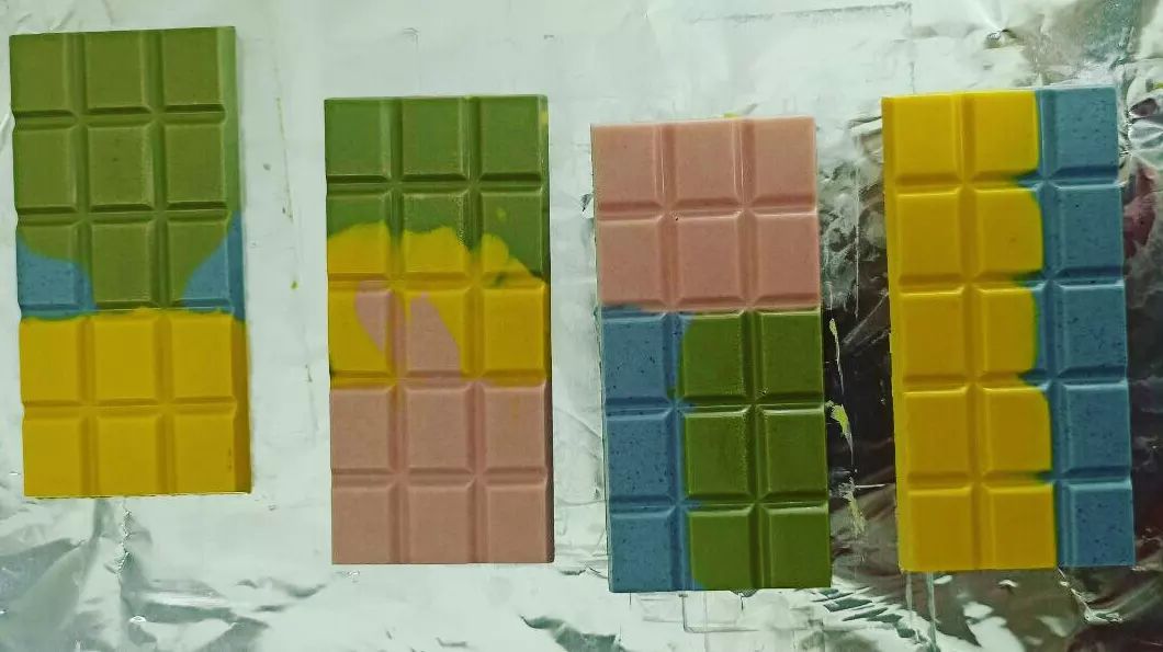 Кольоровий шоколад виготовляється з використанням натуральних барвників, таких як ліофілізована полуниця, метеликовий горошок, куркума та матча.
