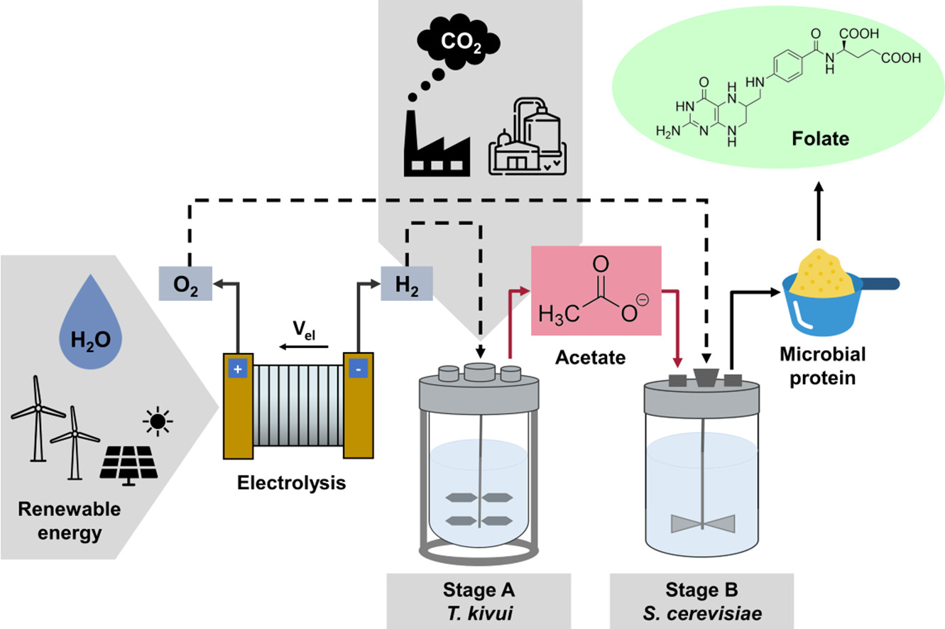 Дослідники з Університету Тюбінгена в Німеччині розробили процес, у якому використовуються вуглекислий газ, кисень і водень для вирощування дріжджів із високим вмістом протеїну та вітаміну B9 (фолієвої кислоти).