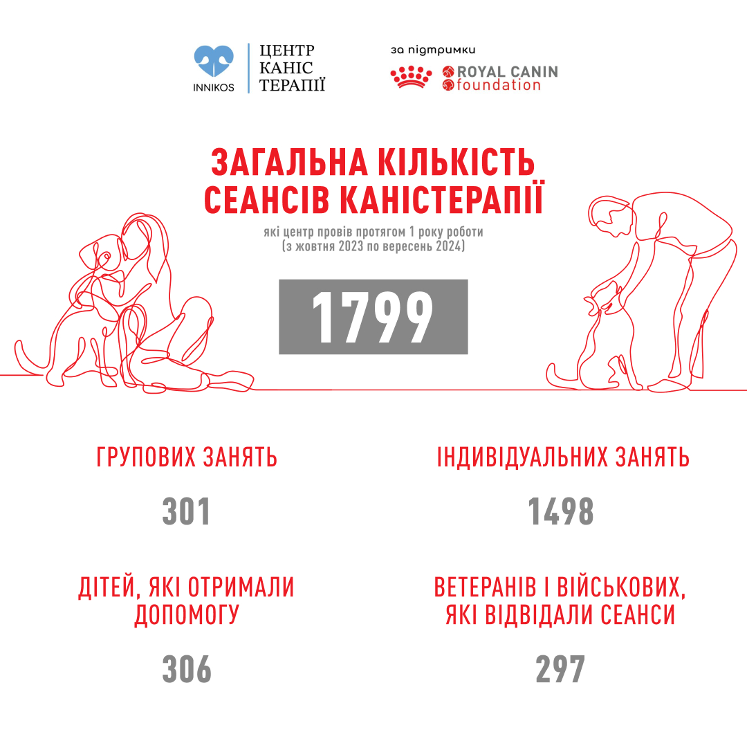 Центр INNIKOS відкрився за підтримки Royal Canin Foundation і став першим з чотирьох таких закладів, які відкриваються в різних містах України. В умовах тривалої війни та постійного стресу, до центру каністерапії звертається велика кількість військових, ветеранів, внутрішньо переміщених осіб, зокрема дітей, які постраждали від війни. Так, за рік роботи центру допомогу отримали понад 1660 людей, з них 306 – діти.