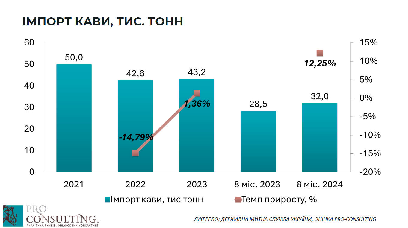 За вісім місяців 2024 року Україна найбільше імпортувала кави з Бразилії, Польщі, В’єтнаму, Італії та Німеччини на суму $173 млн.